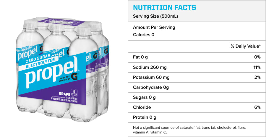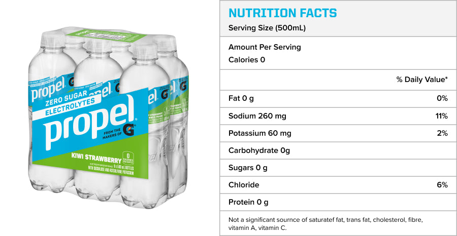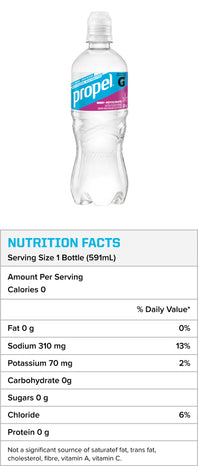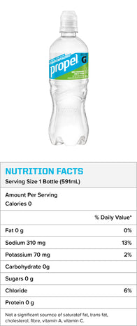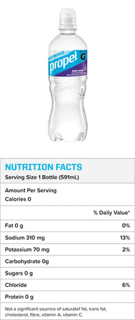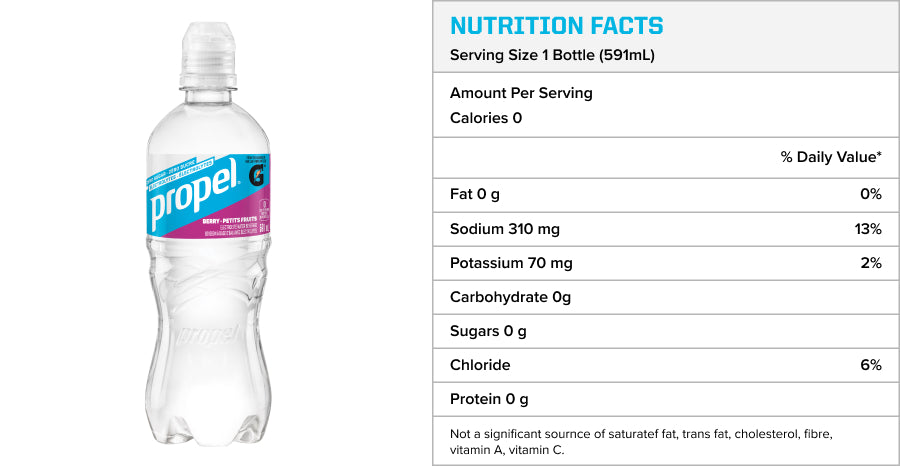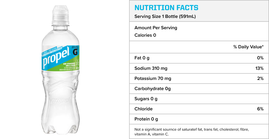 *Propel electrolyte water beverage provides 310 mg sodium and 70 mg potassium per 591 ml serving. Gatorade Sports Drink provides 270 mg sodium and 75 mg potassium per 591 ml serving. Helps to maintain normal water and electrolyte balance.